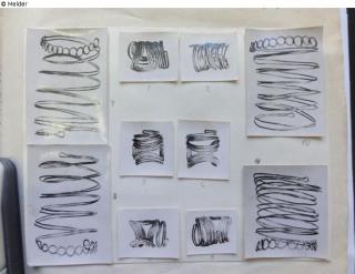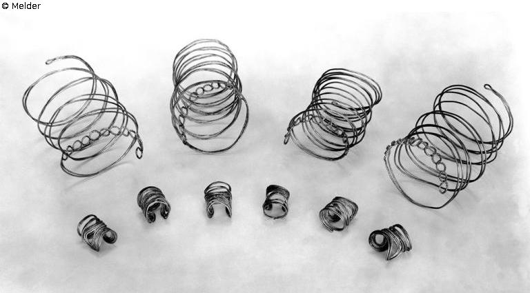 gehört zu einem Gesamtfund, bestehend aus: 4 Armspiralen aus im Querschnitt rundem endlosem Golddraht, doppelt genommen, in acht Windungen, an einem Ende durch Drehung (Wendelung/Tordierung) zu neun Ösen/Schleifen gebogen, das andere Ende nur mit kleiner Öse versehen; sechs Spiralfingerringe aus rundem bis rautenförmigem endlosem Gold-Doppeldraht, dieser in vier Windungen zu einer Scheibe gedreht, die fünfte Windung als Ring zusammengebogen; die Scheibe achtförmig zusammen- und dem Finger angepaßt gebogen. Das innere Doppeldrahtende in der Scheibe vor dem Aufrollen gegenläufig gewendelt. Sowohl Armringe als auch Fingerringe sind paarig, gegensätzlich, gefertigt; Bronzezeit, sog. Fremdgruppenzeit; Gesamtfund 297 Gramm
