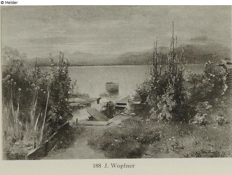 Ein alter Fischer steht gebückt und entlädt seinen Kahn von dem Fang, am Ufer Gärtchen mit Malven; bez. u. l.: J. Wopfner, Fraueninsel 84
