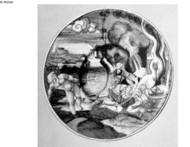 auf der ganzen Fläche mit mythologischer Darstellung. Auf der Rückseite Inschrift.