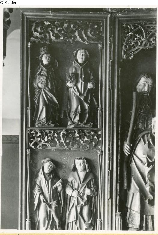 Es fehlen: Kopf der Figur des Hl. Wolfgang (aus dem Schrein, rechte Figur), der linke Fügel mit: Papst mit Buch, Hl. Stephan (beide oben); Hl. Egidius mit Reh, Hl. Sebastian (beide unten). Die Figuren sind etwa 57 cm hoch.