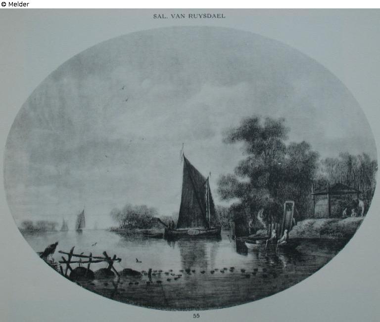 oval. Fluss mit Bäumen. Drei Dorfbewohner in der Nähe eines Mühlsteines; ein weiterer in der Nähe eines kleinen Bauwerkes; ein Paar auf einem Boot. Ein weiteres Boot mit Segeln daneben.