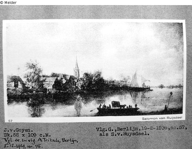 Am Ufer eines breiten Flusses ein langgestrecktes Dorf, überragt von einem Kirchturm. Im Vordergrund links und in der Nähe der Kirche große Baumgruppen, am Ufer sind mehrere Kähne festgemacht. In der Mitte des Vordergrundes eine mit einem Pferdfuhrwerk und Handelsleuten besetzte Fähre, am Dorfende zwei Fischerboote unter Segel. Bewölkter Himmel; Literatur: Hans-Ulrich Beck, Jan van Goyen, Oeuvreverzeichnis, Bd.2, S.285, Nr. 628b IV und Ergänzungsband, S. 218.