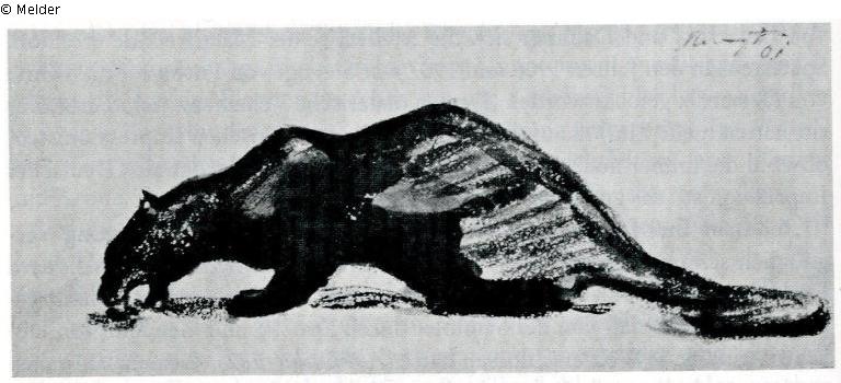 Genial beobachtet und in nur wenigen Strichen wiedergegeben: wie ein Panther / Puma im Frankfurter Zoo sein Futter reißt. Anspannung des ganzen Körpers und höchste Konzentration des Raubtiers (UW); signiert oben rechts: Slevogt 01