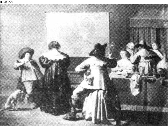 In a room with a map on the wall is a company elegantly-dressed men and women. To the right, at a table laid with food are a woman and a man with goblets in their hands and three more persons. To the left, with their backs to the viewer, are a lady and a