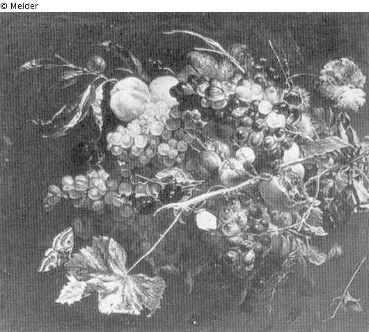 Tafelmalerei: Bild: Stilleben mit Pflanzen, Blumen und Früchten & Früchte: Pfirsich & Früchte: Pflaume & Girlanden, Blumengewinde (Ornament); Stilleben; Pflanze; Blume; Frucht; Insekt & Pfirsich & Pflaume & Girlande