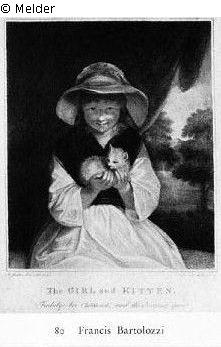 Kleines Mädchen mit Strohhut und schwarzem Brusttuch. Nach J. Reynolds. London, Bartolozzi. KI.-Folio. Beschreibung Lange: Kleines Mädchen mit Strohhut und schwarzem Brusttuch, in den Händen ein Kätzchen. Nach J. Reynolds. London, Bartolozzi & Co., Kl. Fol. Die Plattenfacette abgeschnitten.
