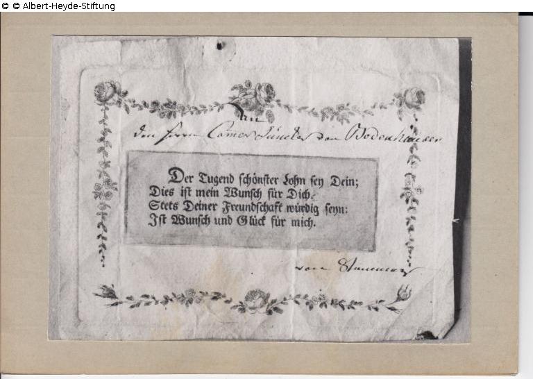 In einem Kranz aus Rosen- und Vergißmeinnicht eingeklebter Zettel mit gedrucktem Vierzeiler: „Der Tugend schönster Lohn sey Dein; / Dies ist mein Wunsch für Dich. / Stets Deiner Freundschaft würdig seyn: / Ist Wunsch und Glück für mich.“ Handschriftlich adressiert: "An den Herrn Cammer Juncker von Bodenhausen", gezeichnet: "von Stammer".