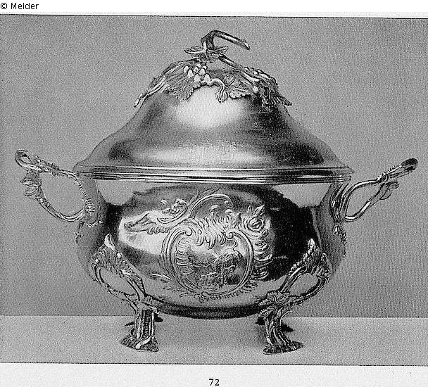 runde gebauchte Wanne auf vier Rocaillefüßen, verziert mit Laubwerk. Seitlich ähnliche Griffhenkel aus Weinlaub und Rocaillen, getrieben zwei Rokokokartuschen, auf dem gewölbten Deckel üppige Weinlaubrebe als Knauf, eingraviert das Wappen des Grafen von der Goltz, im Innern leichte Vergoldung. Berliner Beschau mit Buschstabe C und Meistermarke: Müllers, Berlin, Gewicht: 3400g