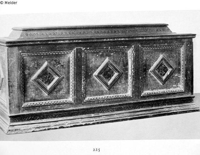 Nußholz, hell gebeizt, auf Original - Podest. Intarsiert Streifen mit geometrischer Musterung (sogenannte Certosina-Technik). Vorderfront drei vertiefte Felder mit aufgesetzten spitzgestellten Rahmen. Decke überhöht, Kanten Profilleisten.