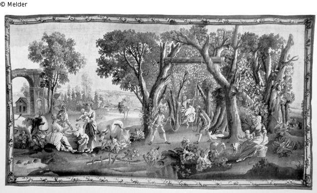 Tapisserie. Rechts unter hohen Bäumen Mädchen auf Schaukel mit zwei Kavalieren, links Landschaftsausblick, davor ländliche Figurenszene. Braune Einfassung in Form einer Rahmenleiste, umwunden von bunter Blumengirlande.