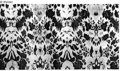 Zwei Teile mit je fünf Bahnen und Überhang. Geschnitten und ungeschnitten, auf cremefarbenem Grund. Aufsteigend Blumenvasen und Blumenmotive grün mit Pfirsichrot, eingefaßt von weinroten und braunen Blumen mit Vögeln dazwischen.