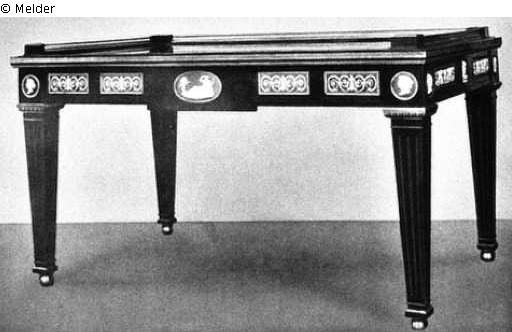 Großes Bureauplat von David Röntgen. Hellgebeiztes Mahagoniholz. Auf rechteckigen Spitzbeinen mit Messingkanneluren die Zarge, die mit 24 Biskuitplatten in der Art der Wedgwoodbiskuits verziert ist. In die Schreibplatte eingelassen königsblaue opake Glasscheibe. Überaus fein gearbeitete, ziselierte und gravierte Bronzestäbe, Kapitäle und Galerie. Von Röntgen vermutlich während seines Gothaer Aufenthaltes für den dortigen Hof angefertigt. Die Biskuitplatten aus der Porzellanmanufaktur zu Ilmenau. Erworben aus Inventar des Residenzschlosses der Herzöge von Sachsen-Altenburg