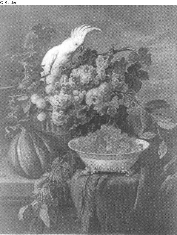 mit Kakadu, vor dem ein großer Korb mit Trauben und anderem Obst und eine weiße Schale mit Kirschen steht; Goldrahmen; signiert