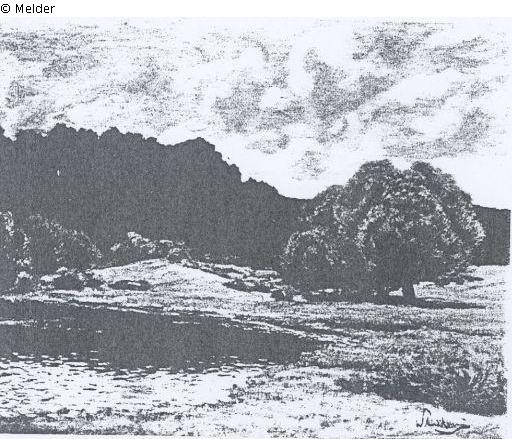 Seebucht an einer mit Weiden bestandenen Wiese. Dahinter dunkler Kiefernwald. Bez. Re.u.: W. Leistikow
