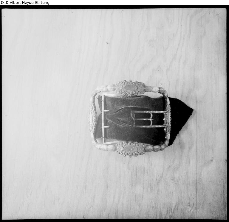 Schnalle mit rechteckigem, astragaliertem Rahmen. Jeweils in der Mitte der Seiten um ein Oval und zwei Blütenmotive (?) ein granulatartiger Dekor. Doppelter Schnallendorn.
