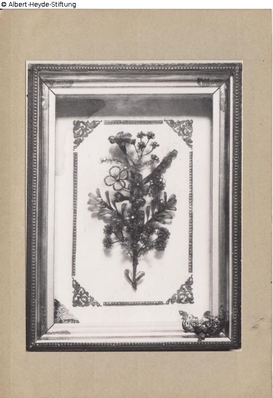 Blumenstrauß mit Bastschleife in vergoldetem Kastenrahmen.