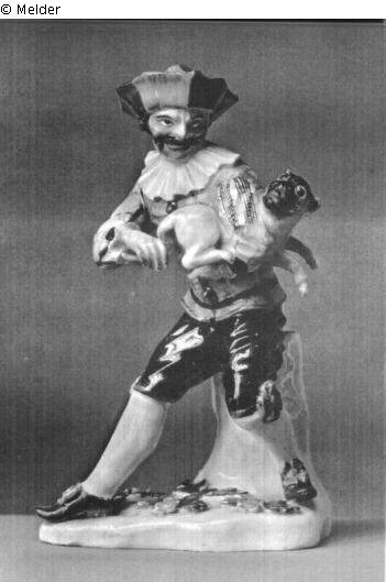 Der Komödiant lehnt sich mit vorgeneigtem Oberkörper an einen weißen Baumstumpf. Das linke gebeugte Bein hat er weit zurückgesetzt, das rechte seitlich vorgestellt. Unterm linken Arm hält er einen schreienden Mops, dessen Schwanz er wie einen Drehling mit der rechten Hand bewegt. Er singt dazu mit weit aufgerissenem Mund, so daß Zunge und Zähne sichtbar werden. Er trägt eine rot, gelb und blau gestreifte Kappe, einen weißen plissierten Kragen, ein blassviolett, gelb und und lichtblaugrün gerautetes Wams mit goldenen Borten, schwarzen Aufschlägen und schwarzem Gürtel, schwarze Kniehosen mit goldener Einfassung und blauen Rosetten, weiße Strümpfe und rote Schuhe mit gelben Absätzen und Rosetten. Am linken Oberarm ist ein Notenblatt befestigt. Der unregelmäßige vierseitige Sockel ist weiß mit einem Belag blauer Vergissmeinnichtblüten und grüner Blätter.