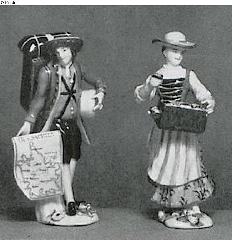 Hausierer und Tabulettkrämerin. Gegenstücke. Der Krämer mit Tragkasten auf dem Rücken, einer „Madame N. N. à Dresde“ beschrifteten ovalen Schachtel unter dem linken Arm und einer Karte von Kursachsen in der rechten Hand. — Die Krämerin mit Warenkasten voller Galanterien, eine Dose mit der rechten Hand feilbietend. Der Krämer in grünem Rock, purpurner Weste und schwarzen Kniehosen. Die Frau in grünem Mieder, hechtgrauem, schwarz- und goldgeblümtem Rock und purpurrosa gestreifter Schürze. Repariert. Ohne Marken. Modell der Krämerin aus der Gruppe des „Herzdosenkaufs“ von Joh. Joachim Kändler.