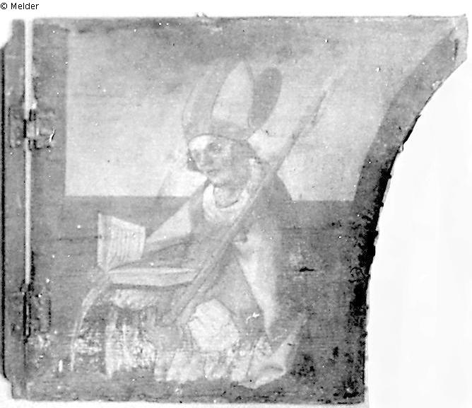 Die Halbfigur „steht, in Bischofsmütze und Chormantel nach links gewandt. Er hält einen langen Pfeil und liest in einem aufgeschlagenen Buch, das er in der Linken hält. ... Rechter Bildrand konkav geschweift ... Gehörte zu einem Skulpturenaltar aus Kronac