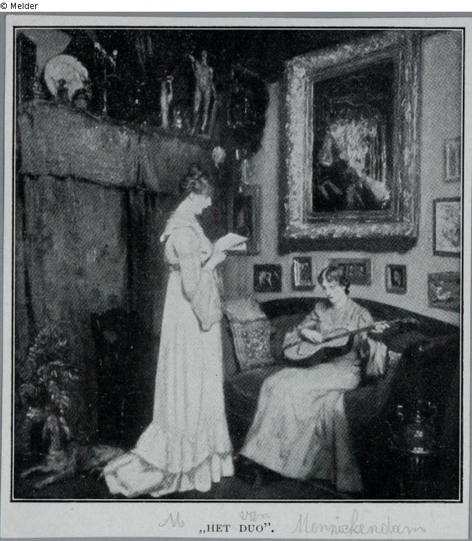 Unterschrieben und datiert. Inschrift 1908. Musizierende Damen in einem kunstvoll eingerichteten Interieur, ein Mädchen in weißem Kleid steht und singt von einem Notenblatt, während ein anderes Mädchen auf einem Kanapee sitzend, sie mit einer Gitarre begleitet.
