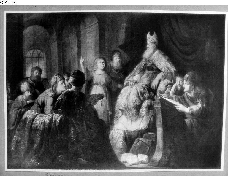 auch Titel (niederländisch): Hoogepriester en volgelingen; in reichem Ornat, inmitten von Sitzenden, unterhält sich ein Hohepriester mit seinen Jüngern