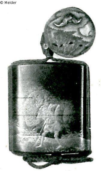 Sammlung Eduard Fuchs, erworben zwischen 1912–1925 und in dessen Besitz bis 1933; 25.10.1933 Beschlagnahmung durch die Gestapo; zwangsweiser Verkauf (Zahlung Reichsfluchtsteuer) 1937 durch seine Tochter Gertraud Fuchs: Versteigerung Auktionshaus Rudolph Lepke Berlin, Katalog 2115 - am 15.10 und am 16.10.1937 wurde diese Kleinplastik unter Nr. 328 versteigert: „INRO: Schwarzlack, fünfteilig. Zwei Männer mit Reisig und Trageeimern in Goldlack. Knopfnetsuke. 7 cm. Japan. Abbildung Tafel 11“.