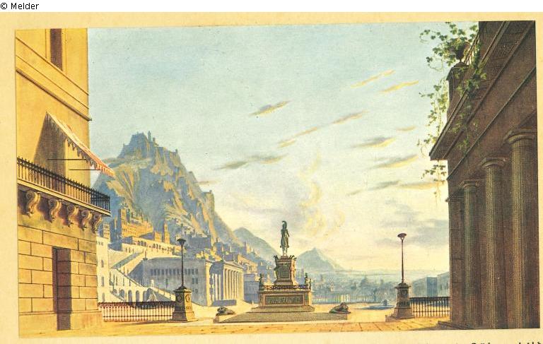 Bühnenbildentwurf für das Königsstädtische Theater in Berlin. Von einer Terrasse blickt der Beschauer auf eine große Stadt mit Kirchen, Palästen und antiken Tempeln am Fuße hoher Berge, im Vordergrund ein Reiterstandbild.
