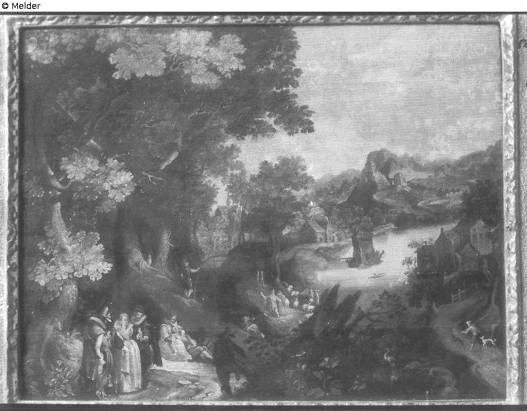 Eine bewaldete und felsige Landschaft. In der Mitte ein Tümpel, rechts davon eine Häuserzeile. Im Hintergrund ist eine Kirche zwischen einigen Bäumen. Links am Rand eines Waldes eine elegante Gesellschaft in prächtigen Kleidern.