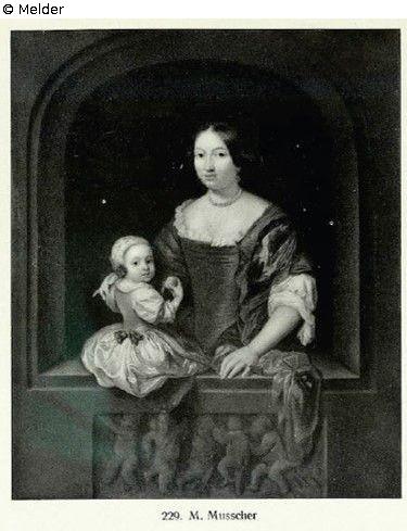 die Dame in braunem Seidenkleid hat das Kind, welches einen Apfel hält, auf die Brüstung eines Steinfensters gesetzt. Unten ein Puttenrelief. Goldrahmen