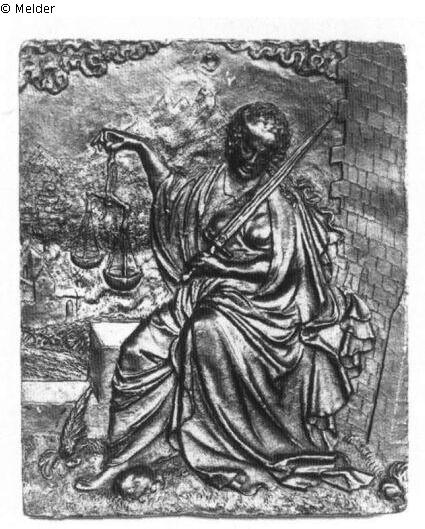 Rechteckige Plakette, oben eine Durchbohrung. Auf einer Mauerbank neben einem Gebäude sitzt Justitia, in ein weites Gewand gehüllt. Die Waage hält sie in der erhobenen rechten Hand, das Schwert in der linken. Im Hintergrund sieht man eine bergige Landschaft mit einer Wassermühle. Die Plakette stammt aus der Folge der sieben sitzenden Kardinaltugenden, zu der auch die nachfolgenden beiden Stücke gehören. Das Modell in Solnhofener Stein (Weber 1975, Nr. M63,5) befindet sich im Kunsthistorischen Museum in Wien.