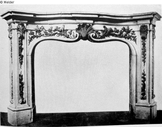 Der verkröpfte Sturz getragen von zweiseitigen Pilastern, ebenso wie das kielbogendförmige Gesims verziert mit vergoldeten, in hohem Relief gehauenen Blütenzweigen und Muscheln. Abbildung Vertseigerungskatalog Tafel 38 a;