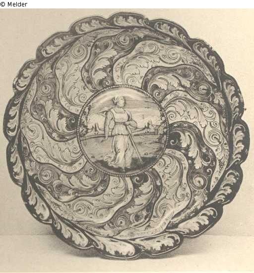 A FAENZA TAZZA WITH "SCANNELLATO" MOULDING, painted a berettino on the convex centre with a full-length figure of Thisbe in orange and blue robes with a sword, the hilt on the ground, a typical blue hilly landscape in the background and alternate orange and green " scannellato "fluting painted with blue leaf motifs, enclosed by a dark blue rim, the underside with orange and blue feathery leaves following the moulding of the panels, on a stout conical foot, llin., botega of Virgiliotto Calamelli da Faenza, circa 1540