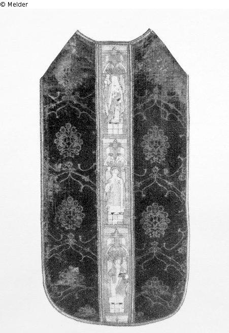 Mit vertieftem Granatapfelmuster. Vor- und Rückseite ein gestickter Stab aus Gold, Silber- und farbige Seide mit Heiligengestalten unter Architekturbögen, u. a. Nikolaus von Bari und San Antonius von Padua.