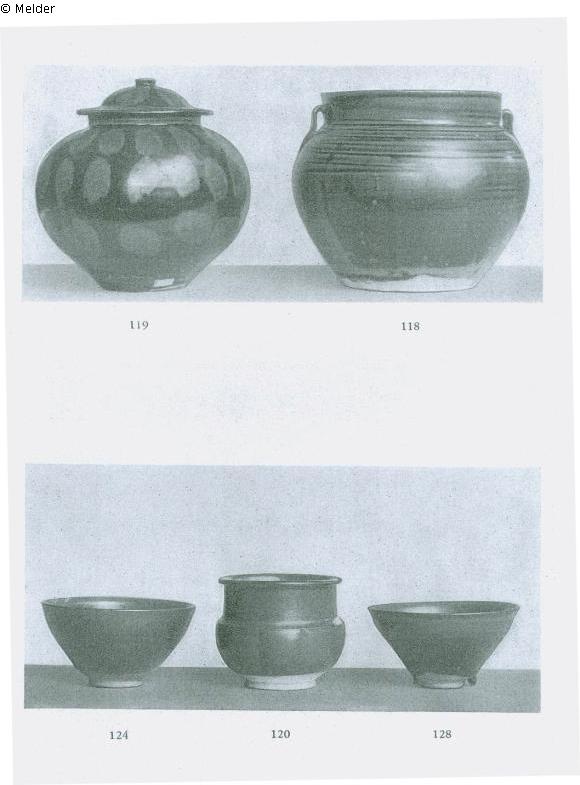 Die Wandung kürbisartig geriefelt. Grünlich-braune Glasur. Chien-yao. Sung.