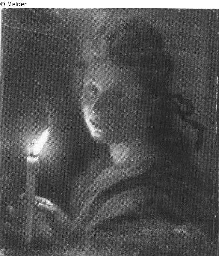 Blick von erhöhtem Standpunkt auf die linke Schulter; Kopf zum Betrachter gewendet und diesen anschauend; in der rechten Hand erhoben eine Kerze, deren Licht einen hellen Schein auf Kinn und Wange der Frau wirft; Signatur: G. Schalcken; Maße: 36 x 30,8 cm