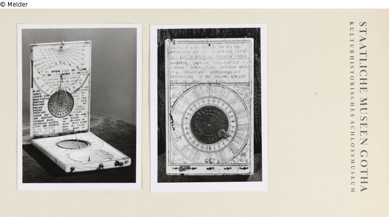 Kompass in Form eines viereckigen Diptychons. Oben eine Messingscheibe. Inschrift: Unterricht dieses kompaß dar inn des polus grad bey ein jeglichen land verzeichnet sted in frankreich campania britania burgundia ungarland lothringerland soffeierland schweizerland beierland osterreich frankenland wirtenbergerland schwabenland. in den landen braucht man den polus 48 grad- innen: in affrikga iddalia hispania venedig tyrckey inn den landen braucht man den polus 43 grad- in den landen braucht man den polus 52 grad niderland flandern prabant holland gellerland pumern frieland unguland dunnmark polen behemerland meichsen hessen und sachsen in den seesteten braucht man den polus 54 grad- in den landen braucht man den polus 60 grad schweden norweten und muschgawiterland schotland. WEN ICH CAMPAST RECHT SOL WEISSEN SO RICHT MICH NICHT NAHE EISSEN. hans ducher zu nürnberg (in roten und schwarzen Buchstaben)