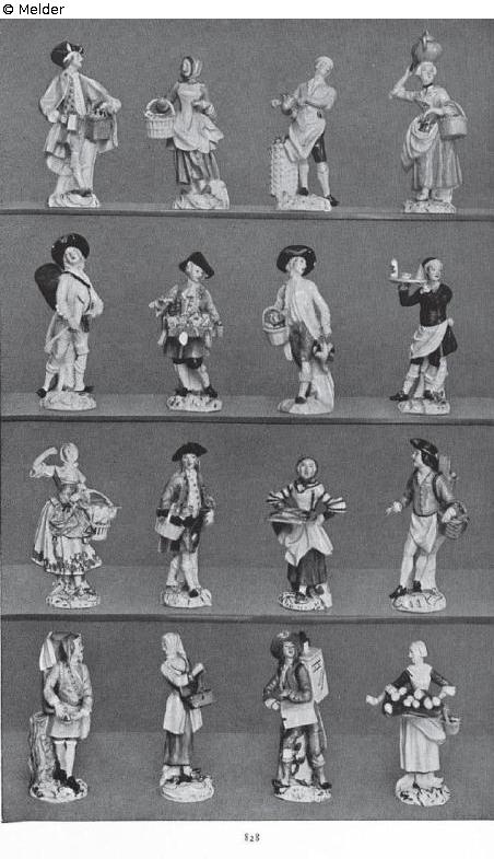 auf beiden Händen eine Korbplatte mit Patisserien und purpurn geblümtem Porzellanbecher in Kopfhöhe emporhaltend. Purpurviolette Zipfelmütze mit gelbem Um-schlag, kobaltblaue Jacke mit gelbem Futter, weiße Schürze, purpurviolette Hosen, weiße Strümpfe und schwarze Schnallenschuhe. auf weißen, zumeist golden gehöhten Rocaillesockeln mit buntem Blumenbelag. Marken: Schwerter. Modelle von Kändler und Reinicke 1753, nach farbigen Zeichnungen, bez. C. G. Huet, die der Französisch (Paris)er Händler Huet nach Deutsch (Meißen) sandte.