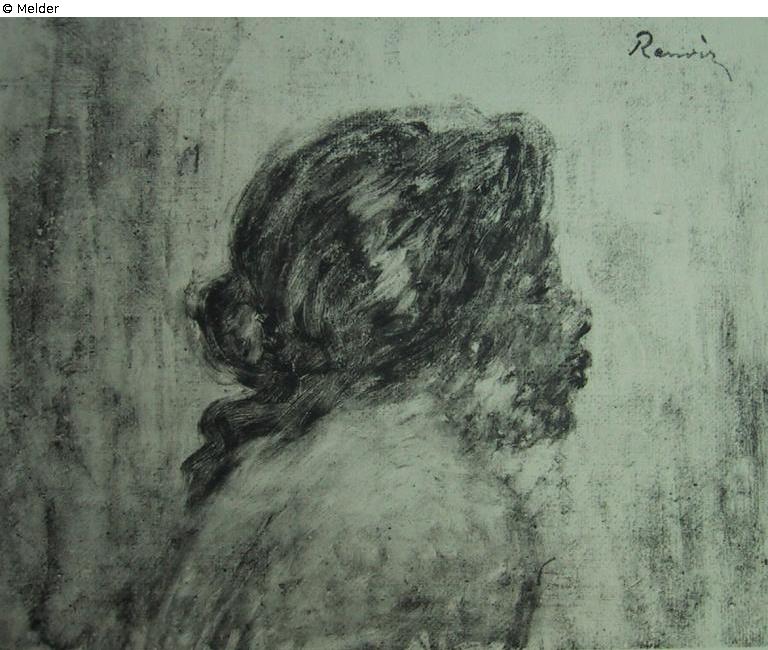 Kopf eines Mädchens / Tête de jeune fille au visage coloré, ses cheveux noirs dénoués, vue en profil et jusqu' aux épaules qui sont nues