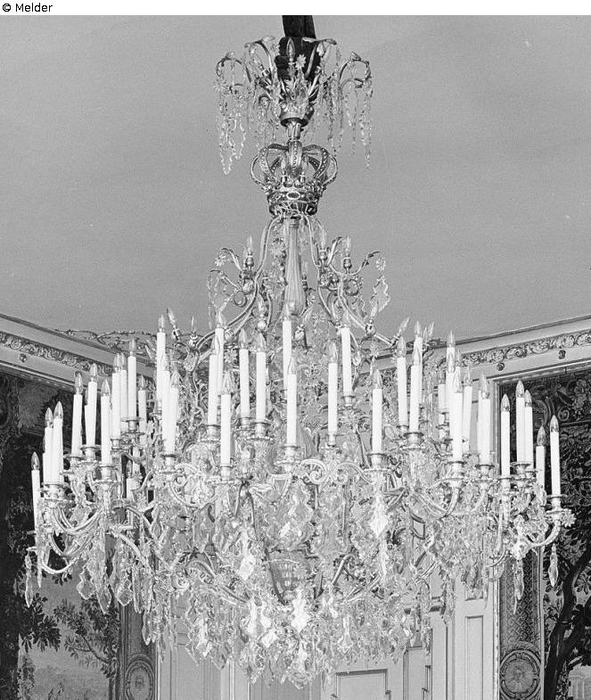 Dresdner Schloss, 2. OG Bärengartenflügel, Gobelinsaal; Im Inventarverzeichnis Nr. 1 vom 31.01.1920, als Bestandteil des Auseinandersetzungsvertrages des Freistaates Sachsen und dem vormaligen Königshaus von 1924, im „Salon“ „1 Bronzekronleuchter mit Glasbehang“ aufgeführt, welcher als rot angekreuztes Rauminventar dem Staat zufällt; Der Kronleuchter aus dem „Kaiser-Salon“ wurde entweder bereits am 13.04.1944, spätestens mit dem zweiten Transport am 21.04.1944 nach dem Bergungsort Rittergut Brauna bei Kamenz ausgelagert. Zu den Verlustumständen dieses Objektes ist nichts bekannt. Ein Verlust im Zusammenhang mit den Ereignissen des 2. WK wird vermutet.