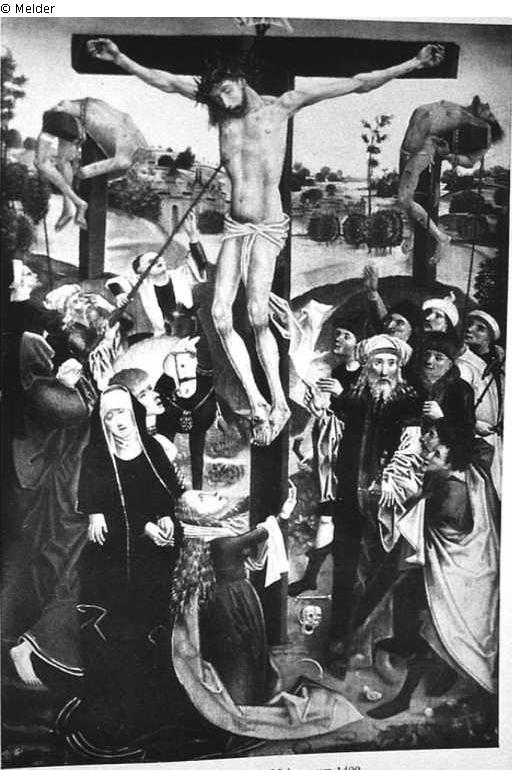 Vorn in der Mitte Christus am Kreuz zwischen den beiden Schächern. Zu Füßen des Kreuzes Magdalena, links Maria und Johannes. Pharisäer, Kriegsknechte und Volk. Hintergrund Hügellandschaft mit Stadtansicht. Ehemals München, Privatbesitz.