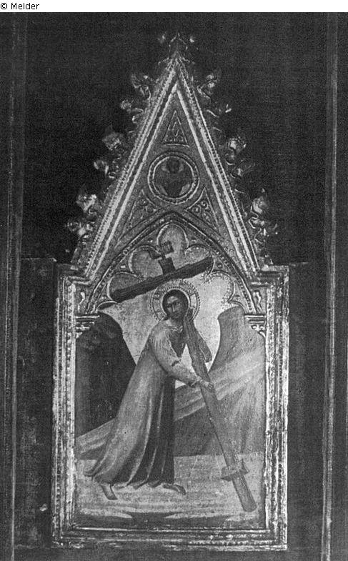 Kreuztragender Christus, mit einem langen, ungegürteten Gewand bekleidet, schreitet Christus, zurückblickend, nach rechts Seine beide Hände sind um den Kreuzstamm gelegt, den er auf seinen Schultern trägt. Den Hintergrund nimmt zum größten Teil eine kahle Felslandschaft ein, der Himmel in gepunztem Gold. Im Kreis des Spitzgiebels kleiner Seraph. Hälfte Die Tafel schließt oben mit einem krabbenbesetzten Spitzgiebel ab, wohl zusammen mit Pendant als Teil eines Altars