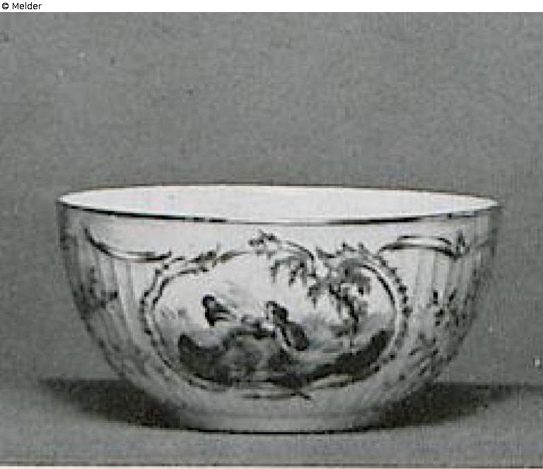 „Reliefzierat mit Kartuschen.“ In den von goldstaffierten Rocaillen umrahmten Kartuschen ländliche Szenen in bunter Malerei nach F. Bouchers „Les Amants Surpris“ (Stich von R. Gaillard) und H. Fragonards „La Bascule“ (Stich von Beauvarlet). Der Bord gelb, zwischen goldstaffierten Zieraten und Goldrand, das Spalier gelb mit goldenen Ranken. Auf dem Boden innen bunte Blumen. Zeptermarke. Berlin, um 1765. Ehemals Sammlung K. Lüders, Berlin; Lenz, Abb. 96. Literatur: Auktionskatalog Hans W. Lange, Wertvolles Kunstgewerbe, Berlin, 19.-21. Mai 1941, S. 158. Nr. 767 (DOI: Externer Link)
