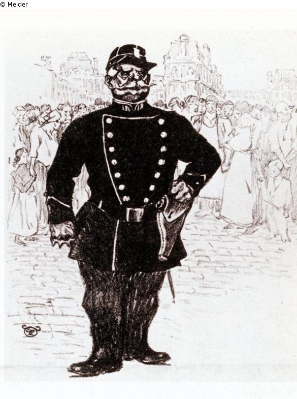 "Im Hintergrund eine dicht gedrängte Menschenmenge in der Großstadt Paris. Im Vordergrund ein bewaffneter Polizist mit gekräuseltem Schnurrbart. In seiner linken Hand umklammert er einen Schlagring und die rechte ruht griffbereit am Pistolenhalfter. Ein Gegensatz zum Bericht einer Zeitung: ‚Dank der friedfertigen Haltung der Polizei, verstrich der 1. Mai ohne Vorkommnisse‘. Doch dem Betrachter wird klar, wenn sich die Masse in Bewegung setzt, kann sie die Staatsmacht nicht mehr stoppen. In dem Aufsatz „Dans la Rue“ (1905) schreibt der Autor Erich Klossowski über Steinlen: ‚Und er malt das Volk als Menge, zum Bewusstsein seiner Kräfte erwacht, im Streik, im Aufruhr, von einer Leidenschaft hingerissen, unaufhaltsam vorwärtsdrängend, malt jenes Massenantlitz der Menge, das sich aus hundert Masken zusammensetzt, wie es vor ihm nur Daumier gesehen hat‘. " (UW)