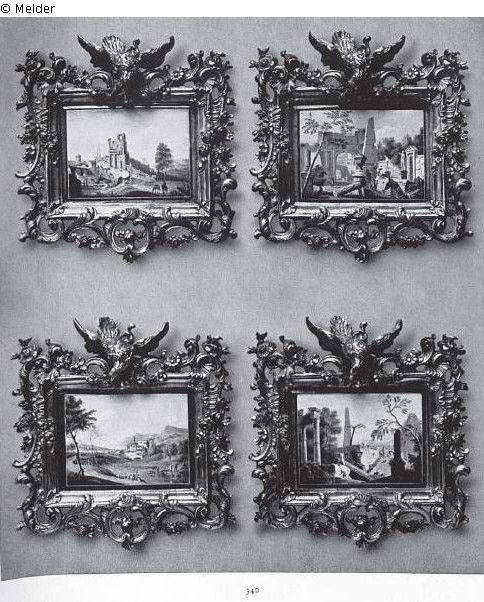 Höhenangabe mit Rahmen. Vier Landschaften in Bronzerahmen. Die rechteckigen, sehr fein gemalten Bildchen zeigen italienische Ruinen- und Flußlandschaften mit zierlichen Staffagefiguren. Die gegossenen, vergoldeten Bronzerahmen mit reichem Laubwerk, Rocaillen und Blumengehängen; oben in der Mitte ein nach unten blickender Adler mit ausgebreiteten Schwingen.