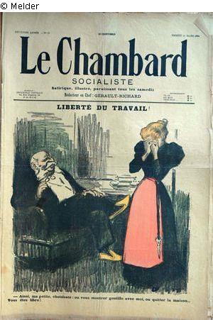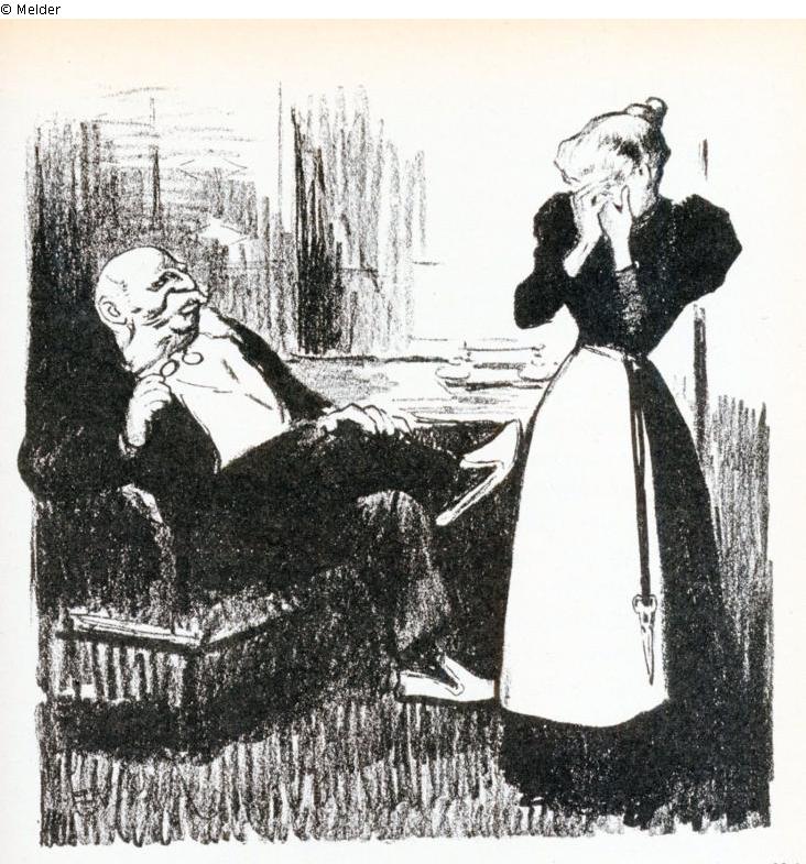 "Der jüdische Patriarch sitzt auf dem Kanapee, hat das Monokel von der Nase genommen und hört dem schluchzenden Dienstmädchen zu. Er hat ihr ein sexistisches Angebot gemacht: ‚Meine Kleine, Sie haben die Wahl: entweder Sie zeigen sich mir gegenüber zärtlich … oder Sie verlassen das Haus … es steht Ihnen frei zu wählen.‘ Hier wird von Steinlen ein schwieriges Feld betreten, er arbeitet mit antisemitischen Stereotypen, jedoch ist es nicht von der Hand zu weisen, dass es auch in jüdischen Familien zu sexuellen Übergriffen gegenüber dem Personal kam. Fuchs erzählt uns eine andere Geschichte, statt des Vaters kam es zu Übergriffen des Sohnes." (UW)