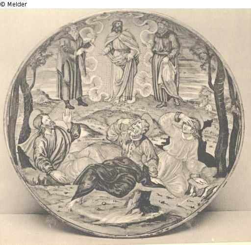 A FINE GUBBIO LUSTRED URBINO DISH, painted by Fra Xanto Avelli, with the Transfiguration, in the upper part Our Lord in light tinted robes against a light golden lustred ground flanked by Elias and Moses in blue and ruby tinted robes, in the lower part figures of St. Peter, St. James and St. John with distant views of cities and trees at the sides, the underside with ruby and gold lustre floral scrolls, the centre of the foot with the inscription "Trasfiguross'il salvator del rnodo. X., 1539 ", Urbino, 1539