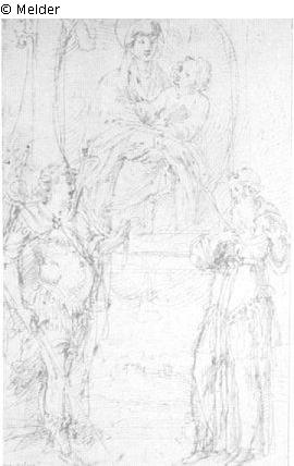 Madonna, auf den Thron erhoben, mit zwei Heiligen