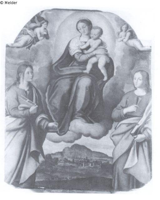 Maria auf einer Wolke sitzend, das Kind auf ihrem linken Arm; zur Rechtenund zur Linken zwei Heilige mit Buch und Schreibfeder, in Kopfhöhe zwei Engel, rechts und links je ein Engel; Graf von Ingenheim´sche Bidersammlung, Erbinventar - Gemäldeverzeichnis: Nr: 64, Reisewitz, 1883; Malarstwo Europejskie, Katalog zbiorów, Nationalmuseum w Warszawie, red. A. Chudzikowski, vol.I, Warsaw 1967,