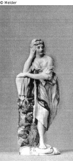 Sie steht dicht neben einem graubraunen, mit grünem Moos belegtem steinpfeiler, auf dem ihre linke Hand liegt und auf den sie sich mit dem rechten Ellenbogen stützt. Ihre rechte Hand liegt flach an der Wange. Auf dem Steinpfeiler liegt eine graublaue Schürze, an dem Pfeiler lehnt der langstielige Besen. Das graue Haar ist mit einem roten Band umbunden, an den beiden Zöpfen hängen lila Bänder. Das kurzärmelige Hemd läßt die linke Schulter frei. Das weiße Mieder ist mit blauen Rosetten gemustert und blau bordiert. Der gelbe Rock ist blau bordiert, rot gefüttert und läßt das Hemd sehen. Beine und Füße sind bloß. Der weiße Sockel ist mit vier golden staffierten Rocaillen eingefaßt. Marke: Krone über Doppel-C. Ritzzeichen: T K I H.