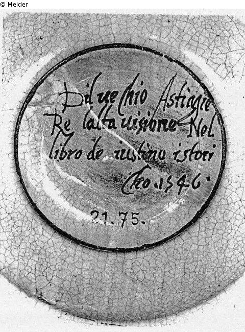 Teller mit flach gemuldeter Mitte und breitem Rand. Dekor in Blau, Gelb, Grün und Mangan auf weißem Grund: Der Traum des Astyages, König der Meder, der aus dem Bauch seiner einzigen Tochter eine Weinrebe wachsen sah, die mit ihren Zweigen ganz Asien überschattete. Gelbe Randlinie. Auf der Unterseite im Fußring blaue Inschrift "Dil ... Astiagie Re lalta visione Nel libro de iustino istori ... 1545". Auf Klebeetikett u.a. bez. ehem. Smlg. Crodel. Best., Sprung, rest.